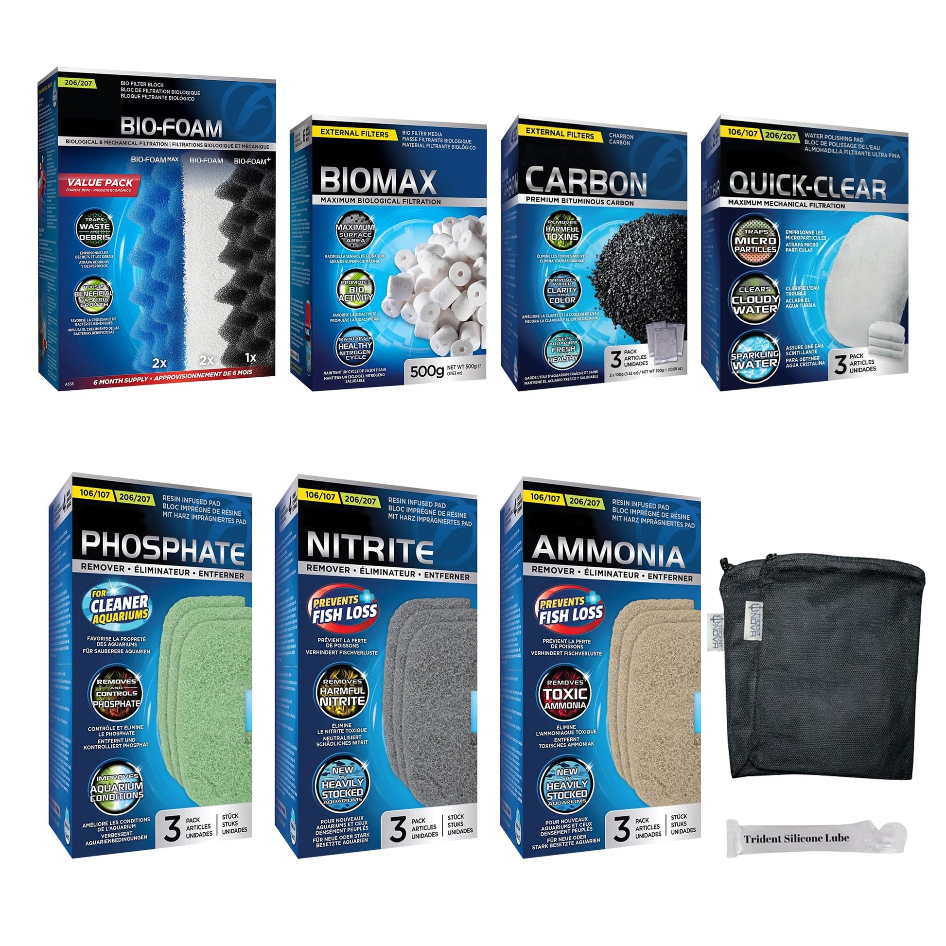 - This 206/207 Filter Media Canister Filter Maintenance and Replacement Filter Media Kit includes 8 items: the 106/107/206/207 Filter Media Quick-Clear Water Polishing Pad, 3-Pack;Carbon, 3 X 100G Packs; 206/207 Filter Bio-Foam Value Pack; BioMax Media 500G; Filter Ammonia Remover Pads, 3-Pack; 106/107/206/207 Filter Phosphate Remover Pads, 3-Pack; Filter Nitrite Remover Pads, 3-Pack; and 3 Trident Nova Aquarium filter media bags and 1 silicone lube 1cc